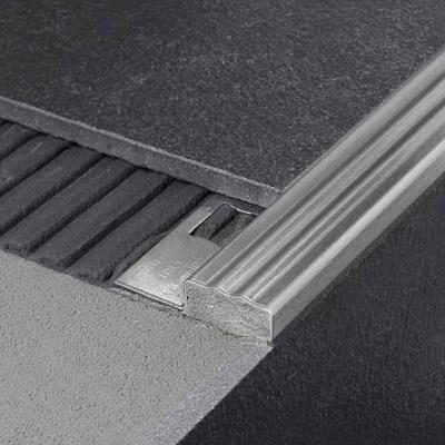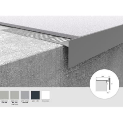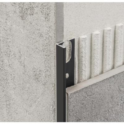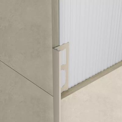 Has an L shape that clearly covers tiles, such as rectified porcelain stoneware.